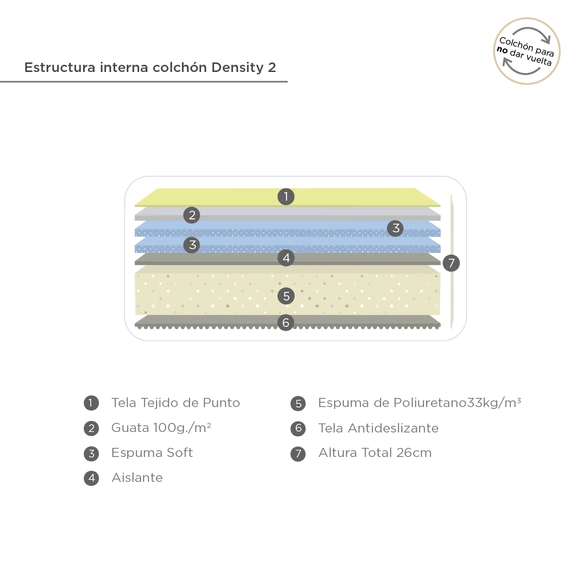 IDEAL PARA MANTENER UNA POSTURA SALUDABLE DURANTE EL DESCANSOEl modelo Density 2 se compone de espuma de poliuretano de Alta densidad, con superficie en Tela de Tejido de Punto y laterales tapizados con diseños exclusivos en tejidos de Jacquard. Está especialmente diseñado para el cuidado de la espalda, máxima firmeza y soporte. |